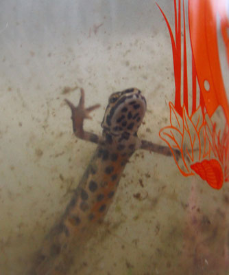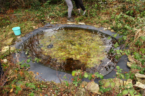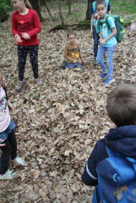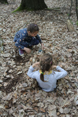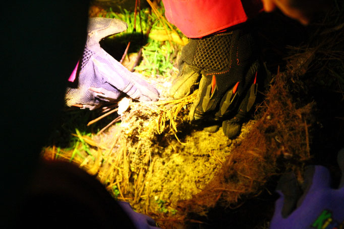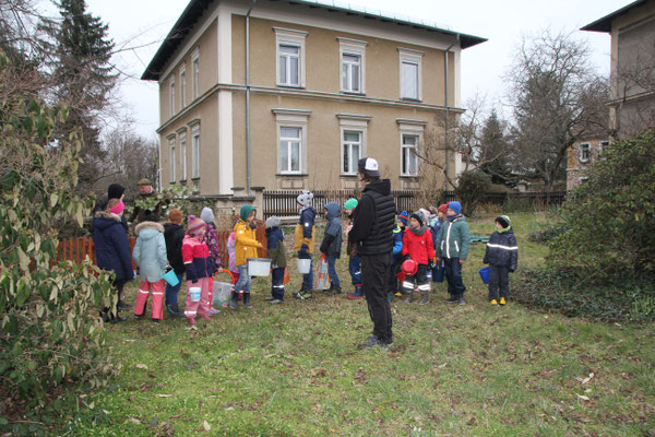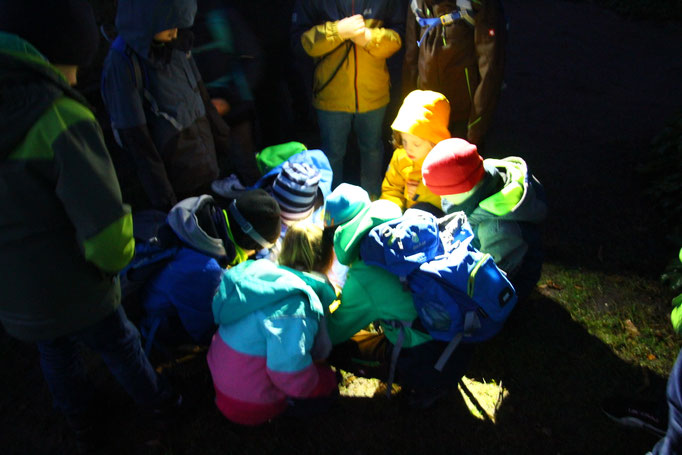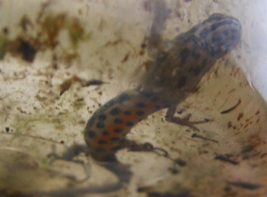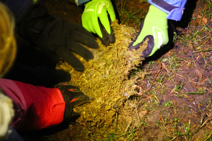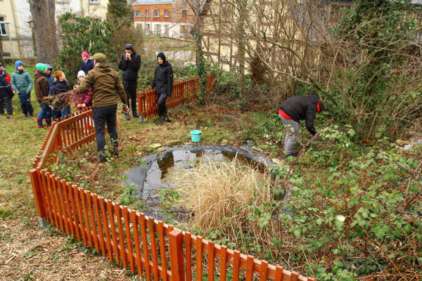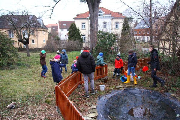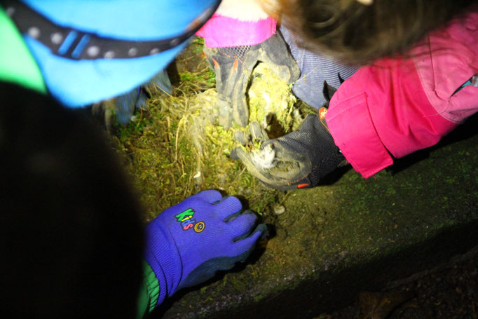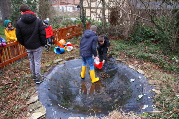 Dann ging es aber ganz schnell hinaus zu den Molchen. Erst sahen wir einen völlig grünen Tümpel, voll mit Laub und Entengrütze. Den mussten wir nun entleeren. Die Kinder hatten wirklich Eimer dabei, so viele wie noch nie, den Eltern sei Dank. Vom Riesen Malereimer, bis zum Mini Sandkasteneimer war alles dabei. Ich hatte meinen Nudeldurchschlag mitgebracht, so konnten wir das Laub filtern. Schon nach wenigen Minuten konnte ich den ersten Molch ankündigen, es war ein großer bunter Prachtkerl in seiner Molchtracht. Die Kinder waren begeistert. Zwei weitere folgten. Eimer um Eimer wurde durchgereicht, und jeder Zentimeter stinkendes verfaultes Laub vorsichtig durchsucht. Bis auf ein paar Regenwürmer und Insekten kam aber nichts mehr ans Tageslicht. So füllten wir dann den Teich, der jetzt kein Tümpel mehr war mit frischem Wasser. Die Zeit war vergangen, es war alles ziemlich nass und kalt, so daß wir uns in das warme Ameisenzimmer zurück zogen. Herr Hermann startete noch ein Wissensquiz, an dem alle Kinder prima teilnahmen. Natürlich gab es auch Preise, und was für welche!