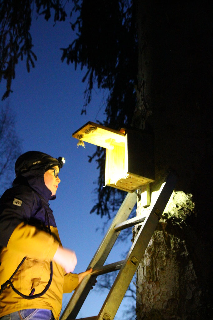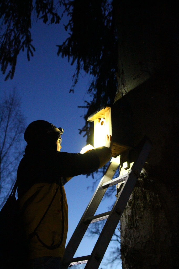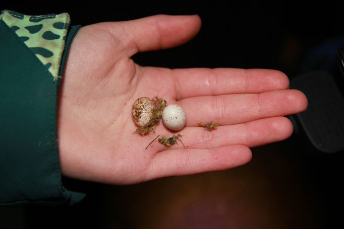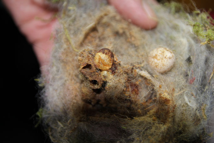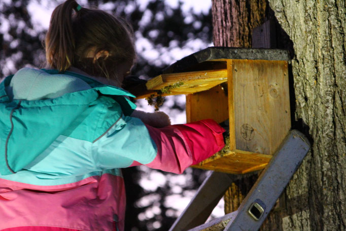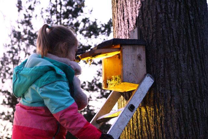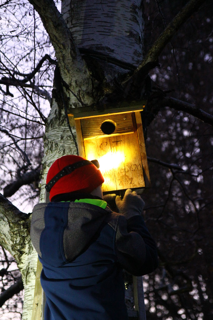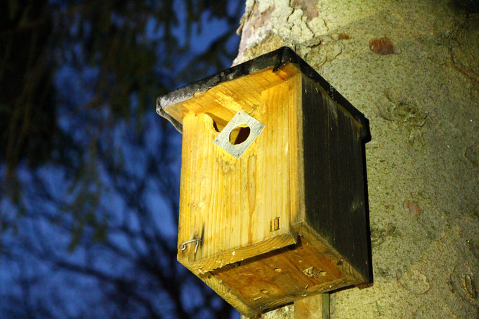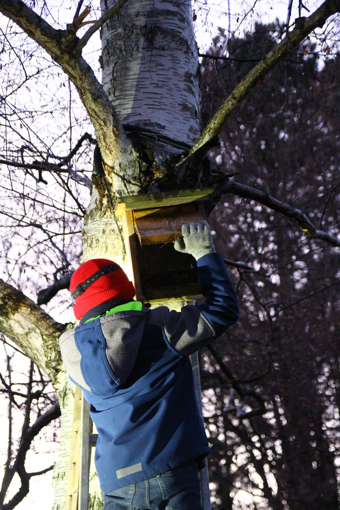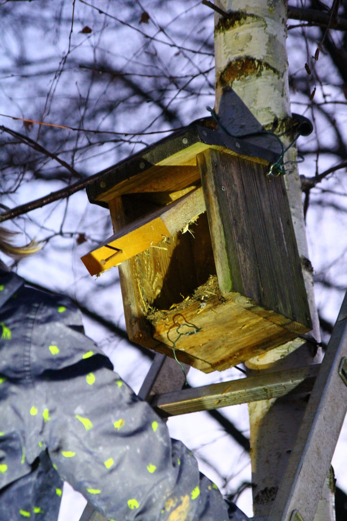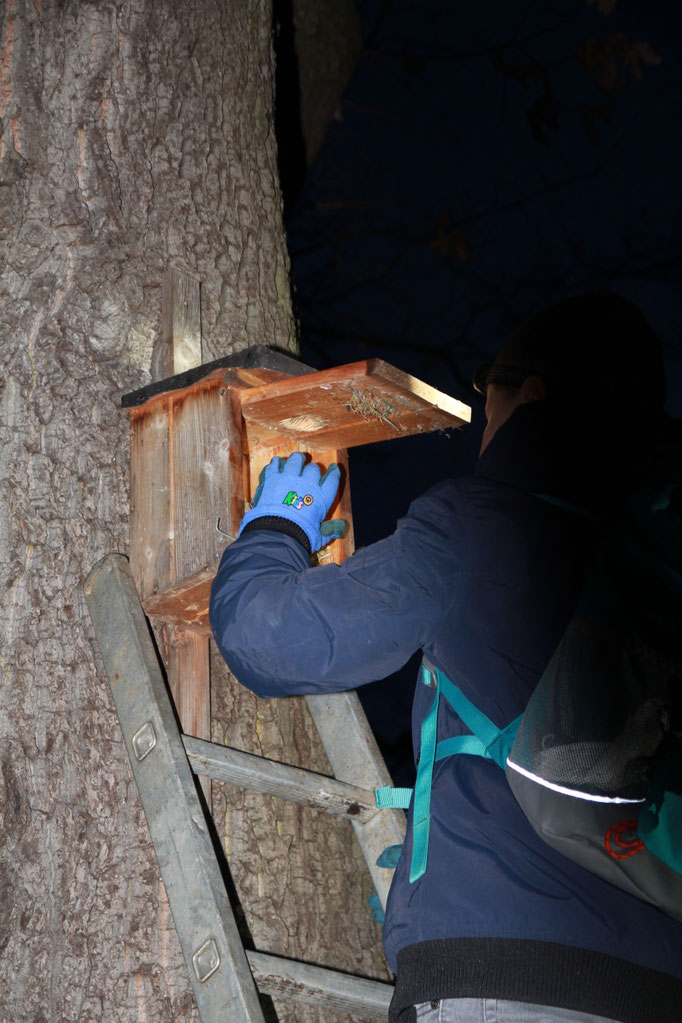 Danach, nachdem alles Organisatorische geklärt ist, laufen wir zum Briesnitzer Kirchfriedhof. Das kleine Muttiheft begleitet uns, die Aluleiter ist schnell gefunden, nun geht es von Baum zu Baum. Die Ameisen wissen, Mütze, Brille, Handschuhe sind angesagt, nicht nur weil es ein wenig frisch ist, sondern weil wir uns vor Flöhen schützen wollen, die in den Nestern vorhanden sein können. Wie gesagt, zwei Jahre sind vergangen. Etliche Bäume fehlen, zum Beispiel die ersten zwei am Eingang. So suchen wir was übrig geblieben ist. Immer wieder wird man überrascht, was sich mit der Zeit verändert hat. Kästen die wir nicht kennen wurden aufgehangen, Kästen fehlen gänzlich, Kästen sind von größeren Vögeln beschädigt worden. Die Nummern und die Reihenfolge ist nun leider völlig durcheinander gekommen. Das tut aber dem Forscherdrang keinen Abbruch. Jedes Kind möchte auf die Leiter, und einen Kasten öffnen, aber die kleinsten haben es schwer an die Kästen zu gelangen. Taschenlampenlicht zuckt durch den späten Nachmittag, zu entdecken gibt es viel. Nester die aus dicken Teppichen von Moos gewebt wurden, Eier die sich darin verstecken, leider auch Überreste von Jungvögeln die es nicht geschafft haben. Nebenher gibt es noch das Grab des Lärchenexperten Rudolf Pätzold zu bestaunen. Summasummarum finden wir 6 ehemals besetzte Kästen. Wir können nur hoffen, die Vögel nehmen die Kästen 2023 wieder an, und versuchen ihr Glück, mehr ist es ja nicht.