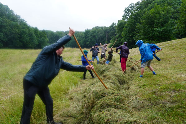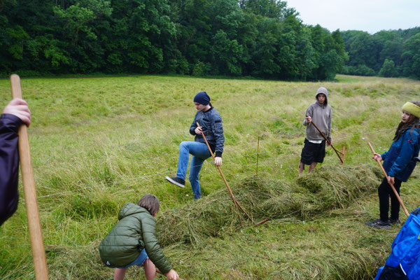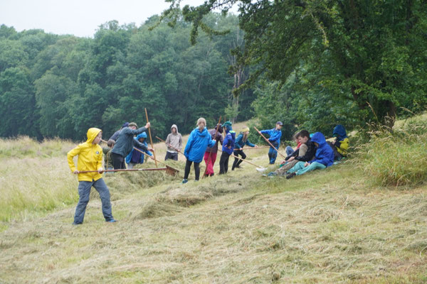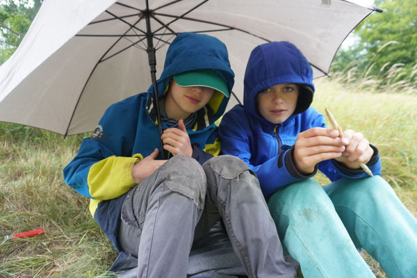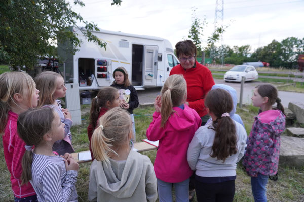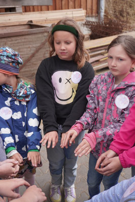 Es hatte ein wenig geregnet, tröpfelte immer noch, als sich die Ameisen auf dem Pfarrhof trafen. 24 Kinder waren an diesem Freitag wieder zusammen gekommen, gut ausgerüstet mit Gummistiefeln und Gummijacken, es konnte los gehen. Eigentlich sollte es " Treppenbusch die zweite " heißen, aber bei der letzten Aktion waren wir einfach zu gut, der Treppenbusch war fertig gestellt worden. Die Zschone hat ja aber noch viel mehr zu bieten, zum Beispiel die einmalige " Ameisenwiese" mit ihrer Biologischen Vielfalt. Dahin machten wir uns auf den Weg,wie immer mit einem begleit- Pony. Auf der Wiese angekommen, wurde erst einmal das Ameisenbrot gebrochen und verteilt. Alle Kinder packten ihre Brotzeit aus, am Ende gab es sogar Gummibärchen für alle. Nach der Stärkung ging es nun wirklich um die Erkundung der Wiese. Es wurden zwei Gruppen gebildet, " Vielfältiges Leben" und " Löwenmäulchen". Die Teamer schwärmten mit ihren Gruppen aus, und versuchten mit Hilfe der modernen Technik, so viele Blumen wie nur möglich zu finden. Es machte den Kindern sichtlichen Spaß, ihre Blumenwiese zu erkunden. Nachdem beide Teams von ihrer Erkundung zurück waren, wertete Herr Hermann die Ergebnisse aus, und kam auf 15 unterschiedliche Exponate. Nun hatten die Teams die Aufgabe, eine kleine Geschichte zu erfinden, in der Blumen eingebaut waren.