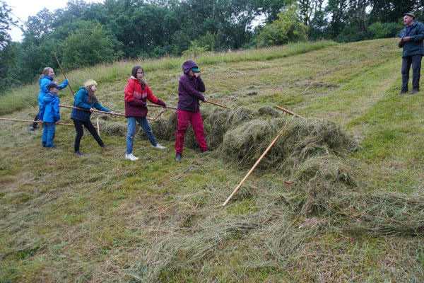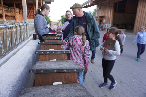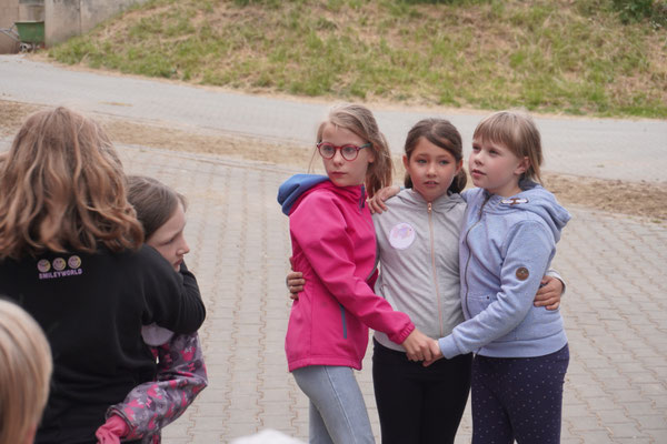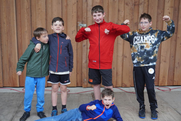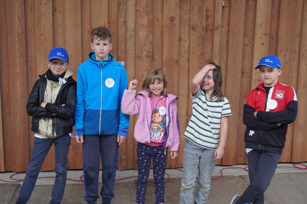 Auch dieser Tag war ein schöner Sommertag, leider war nun die Rüstzeit zu Ende. Aber wie immer gab es noch das große Abschlussquiz. Nach dem Frühstück hieß es Sachen packen und auf den Anhänger verstauen, nur der persönliche Rucksack mit den wichtigen Kronen war noch dabei. Die Kinder, die Teamer und die Erwachsenen Helfer versammelten sich auf dem Hof von Areal Palme, die beiden Gruppen Biber und Störche saßen zusammen, und erwarteten die Fragen, die sich Betreuer Benny die ganze Nacht zuvor ausgedacht hatte. Wer am schnellsten Antworten konnte, war klar im Vorteil beim Punkte sammeln. Und wie es der Zufall oder der Wissensstand nun einmal so will, es musste eben einen ersten und zweiten Platz geben. So ging es eine ganze Weile hin und her, bis der Gesamtpunktestand ermittelt wurde. Herzlichen Glückwunsch an die Störche, die mit ihren langen Beinen und langem Schnabel mit 101.5 Punkten vor den etwas behäbigen Bibern mit 98,5 Punkten gewannen. Vielleicht hatten die Biber ja noch etwas Wasser in den Ohren, und konnten nicht alle Fragen klar und deutlich verstehen, wer weiß das schon? Auf jeden Fall gab es für jedes Kind einen kleinen Preis, und für die " Sieger" einen etwas größeren, traurig war aber niemand, und Tränen gab es keine, bloß gut!