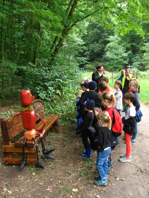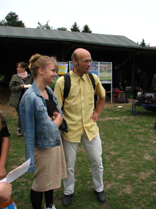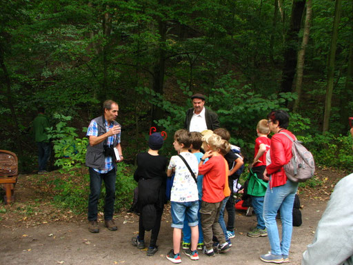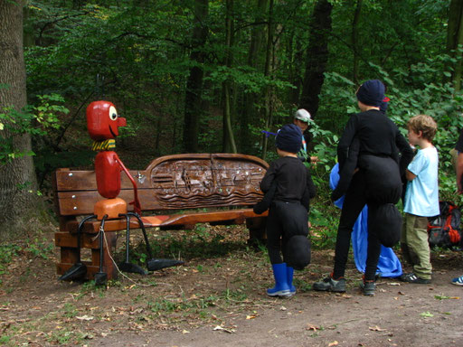 Das war natürlich ein sehr schöner Tag für alle Beteiligten. Unsere Böhmischen Freunde waren auch angekommen, und feierten mit uns dieses schöne Fest. Nach einem Gottesdienst in der Briesnitzer Kirche, zogen die Ameisen, ihre Freunde und Besucher, in den Zschonergrund. Dort wartete bereits der Böhmische Künstler Ivo Svejnoha an der schönsten Bank des Zschonergrundes auf die Kinder und Erwachsenen. Die Bank war noch verhüllt, und keiner hatte sie zuvor gesehen. Natürlich waren es die Kinder, denen die Ehre zu Teil wurde, sie zu enthüllen. Ein aufrichtiges oh und ah war zu vernehmen, als die Hüllen fielen. Was zum Vorschein kam, war ein Meisterwerk der Schnitz und Bildhauerkunst. Vielen Dank lieber Ivo für diese schöne Arbeit. Eigentlich sollte Frau Eva Jähnigen die Grußworte halten, aber sie war verhindert. So übernahm der Umweltbeauftragte Herr Strack diesen Part, und hatte ganz schön was zu sagen.